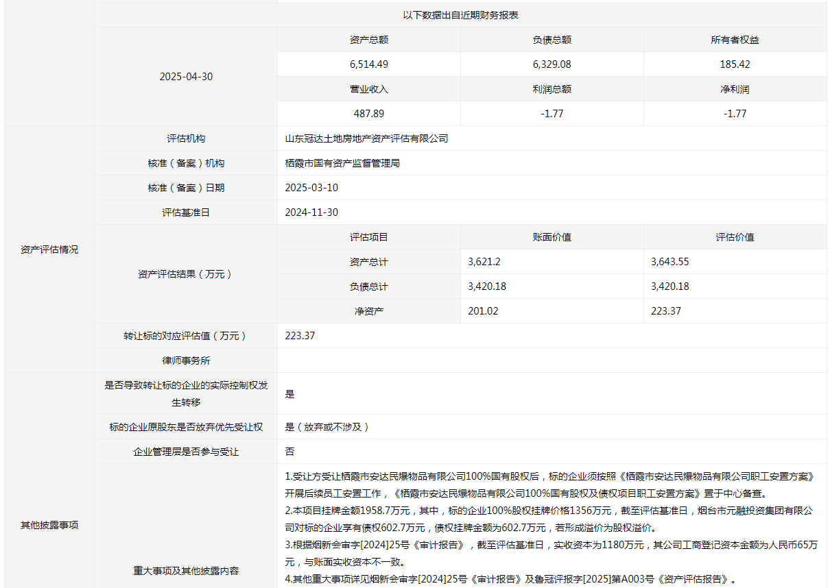 棲霞市安達(dá)民爆物品有限公司100%國(guó)有股權(quán)及債權(quán)